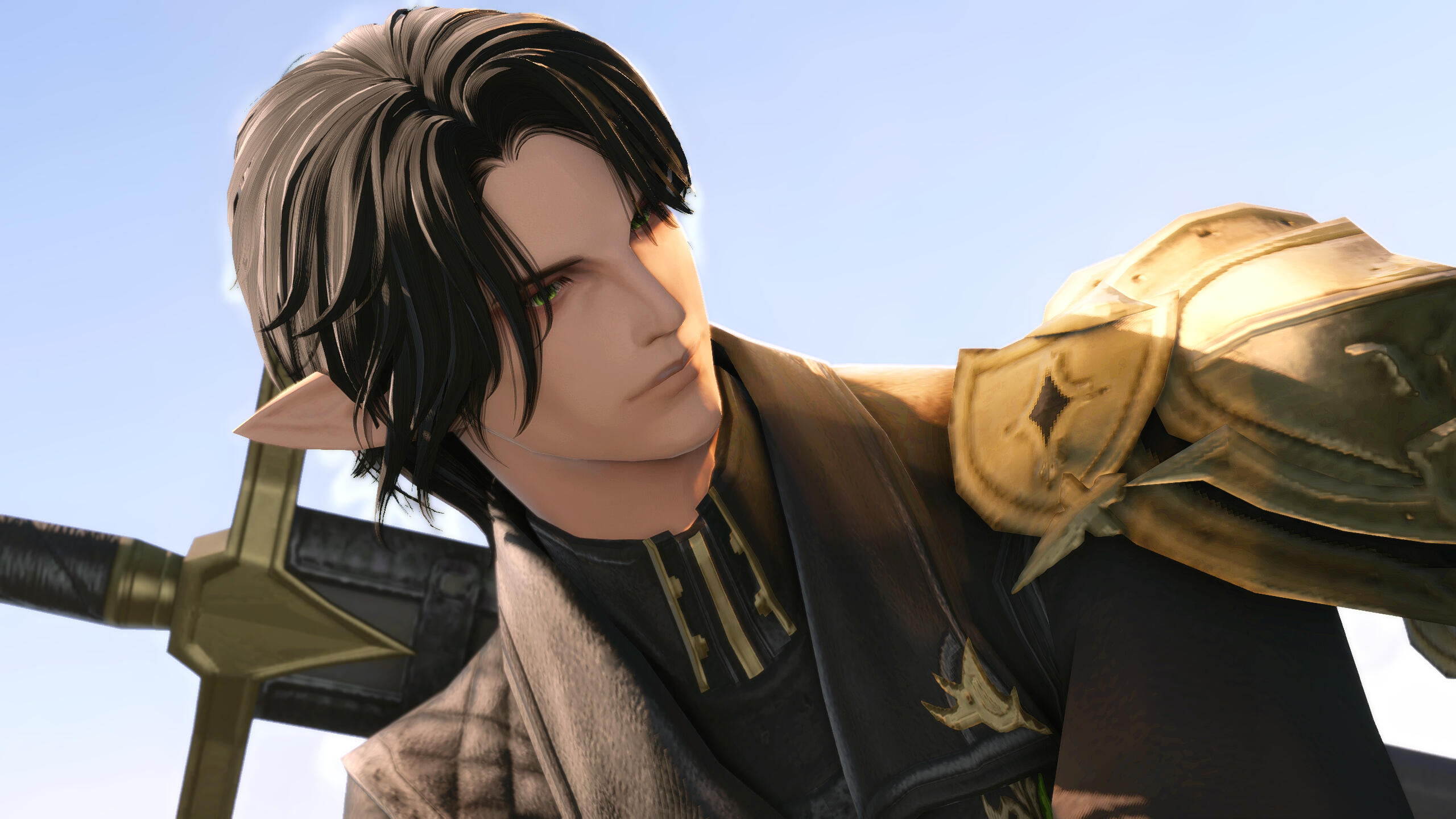 A crown of jet-black hastily-maintained locks rests atop this elezen's crown, adorning the image of the 205 cm tall man much like the rest of his stature. Strong, with toned musculature and plenty of stories imbibed across his skin in the shape of scars, Aris is nigh indistinguishable from many in his line of work: Imposing and with calloused hands, his life has been one of many hardships. All of these which come to light not only in appearance, but in the pragmatic way in which he acts, the dryness of his voice, and the dark corners of every room to which he gravitates; out of sight.Personality